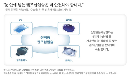 결혼을 앞둔 강지연씨(가명)는 거의 20년간 안경과 렌즈를 끼고 살았다. 안경이나 렌즈를 끼지 않고는 바로 앞의 사물도 흐릿하게 보이는 고도근시이기 때문이다. 게다가 각막두께도 얇아 라식수술도 포기해야 했던 강씨는 초고도 근시도 가능한 시력교정술이 있다하여 안과를 다시 찾았다. 방법은 안내 렌즈 삽입술. 이는 안경을 쓰고도 최대 교정시력이 시력표상 0.5밖에 나오지 않는 초고도 근시거나 각막의 두께가 얇아 각막을 깍아내야 하는 라식수술이 불가능한 환자들의 시력교정 방법이다. 홍체와 수정체 사이에 특수 콘택트렌즈를 삽입하여 시력을 교정하는 방법으로 라식이나 라섹등 레이저로 각막을 깍아내야 하는 방법과는 달리 각막을 그대로 보전하는 방법이기 때문에 안정적인 시력회복이 가능하다. 또한 라식에서 발생할 수 있는 각막절편이나 각막돌출증 같은 부작용이 없고, 안구건조증이나 야간 눈부심, 빛 퍼짐등의 현상이 없다. 만약 수술결과에 문제가 있을 경우 눈 속 렌즈만 제거하면 수술 전 상태로 복귀가 가능하고, 외관상 렌즈가 보이지 않으며 근시 퇴행 없이 수술 후 우수한 시력이 보장된다. 안내렌즈삽입술은 같은 렌즈를 삽입하는 것이 아니라 환자의 눈 상태에 맞는 렌즈삽입술을 선택하여 수술 한다. ICL, 알티산, 알티플렉스, 토릭ICL 등 4가지 수술법이 있어, 수술 전 10여 가지의 정밀검사 후 눈상태를 완벽하게 파악하는 것이 중요하다. 또한 홍채에 구멍을 뚫는 예비 수술도 필요하다. 콘택트렌즈가 홍채와 수정체 사이에 들어가기 때문에 이곳에서 생성되는 방수(눈의 압력을 조절하는 액체)가 잘 빠져나오도록 하기 위함이다. 이처럼 수술 전 검사와 수술까지 다소 시간이 많이 소요되고, ICL 렌즈를 비롯해 수술에 관련된 소모품 비용이 고가여서 수술비용이 비싼편이다. 하지만 이러한 수고와 비용을 지불하고도 그동안 시력교정을 원하지만 방법이 없어 포기해야 했던 환자들이 많이 찾고 있다. 이 수술은 안전성이 최우선으로 선행되어야 하기 때문에 시술을 하는 의사의 술기와 노하우가 가장 중요하다. 청담밝은세상 이종호원장은 국내 최초 렌즈삽입술 도입하여 2009년에만 6000건 이상의 렌즈삽입술을 시행했다. 이원장 이외에도 4명의 안내렌즈삽입술 전문의가 상주하고 있어 안전하고, 확실한 안내렌즈삽입술을 시행하고 있다. 렌즈 삽입은 눈에 국소마취를 한 후 각막 주변부를 약 3mm 정도를 미세하게 절개한 다음, 두께 0.05~0.5mm, 지름 11~13mm 크기의 콘택트렌즈를 접어서 홍채와 수정체 사이의 공간에 삽입하고 자리를 잡아 준다. 수술은 약 일주일정도의 기간을 두고 한쪽씩 시행되며, 수술 시간은 약 20분정도 걸린다. 수술 후 4-6시간 정도 병원에서 안압등을 체크하며 경과를 관찰한 뒤 퇴원을 하게 되는데, 보통 수술을 위한 산동제의 효과가 풀리는 4-24시간 내에 대개 좋은 시력을 얻게 된다. 유럽에서는 이 시술법이 이미 7~8년 전 도입돼, 장기적인 안정성이 검증 되었으며, 청담밝은세상안과에서 수술 환자를 대상으로 경과를 관찰한 결과 야간번짐이나 겹쳐 보임 시력의 질적인 부분에 있어서는 오히려 수술 전보다 더 나아지고, 특히 라식이나 라섹과는 달리 시력 퇴행이 없으며, 최대 교정시력이 증가할 수도 있다고 밝혀졌다. 이 외 ICLl 시술을 받은 사람의 백내장 발생률도 자연 발생률과 차이가 없다는 것은 이미 알려진 사실이다. [OSEN=생활경제팀]osenlife@osen.co.kr 청담 밝은세상안과, 부산밝은세상안과 제공