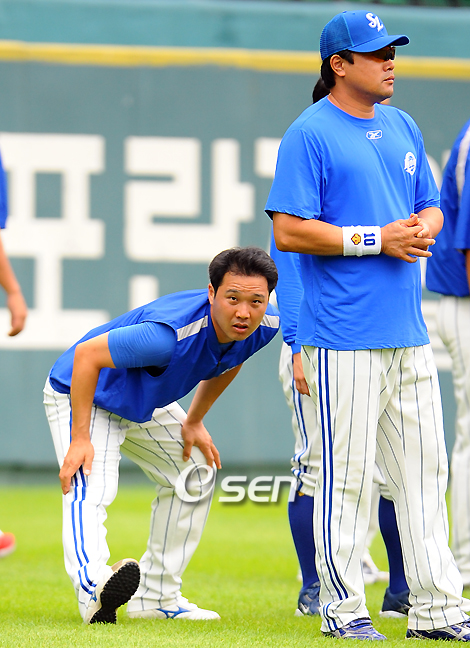 4일간의 짧은 올스타 휴식기를 끝내고 맞이하는 첫 후반기 LG 트윈스와 삼성 라이온즈의 3연전 경기가 28일 오후 잠실구장에서 벌어진다. LG는 전반기 한때 2위까지 올라갔던 신바람의 부활을 기대하며 후반기 첫 선발로 최원호가 나선다. 상위권 도약에 나서는 삼성은 종아리 근육이 파열되는 부상을 딪고 돌아온 주장 박지만이 1군 등록을 했으며 선발투수로 크루세타가 나선다. 경기 전 복귀한 삼성 박진만이 몸을 풀고 있다./잠실=윤민호 기자ymh@osen.co.kr
