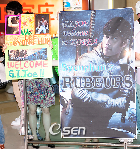 영화 '지.아이.조 : 전쟁의 서막 (감독 스티븐 소머즈ㆍ이하 지 아이 조)'의 배우 이병헌, 채닝 테이텀, 스티븐 소머즈 감독이 한국 프로모션을 위해 28일 저녁 김포공항을 통해 입국했다. 영화 '지.아이.조'는 가공할 최첨단 무기로 인류를 위협하는 강력한 테러 집단 ‘코브라’ 군단과 그에 맞서는 전세계 최고의 엘리트로 구성된 최강 특수 군단 '지.아이.조'의 활약을 그린 액션 블록버스터 영화이다. 또한 이병헌의 본격적인 할리우드 진출작으로 이 작품에서 유창한 영어 대사와 화려한 액션 연기를 바탕으로 악당 코브라 군단 소속의 스톰 쉐도우 역을 맡았다. 이들은 내일 오전 서울 장충동 신라호텔에서 진행되는 기자간담회를 시작으로 각종 인터뷰 등 공식 일정을 소화한다. 이병헌 팬들이 플레카드를 들고 이병헌을 기다리고 있다./김포공항=민경훈 기자 rumi@osen.co.kr