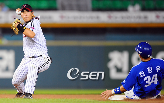 4일간의 짧은 올스타 휴식기를 끝내고 맞이하는 첫 후반기 '2009 CJ 마구마구 프로야구' LG 트윈스와 삼성 라이온즈의 3연전 경기가 28일 오후 잠실구장에서 벌어졌다. 6-5로 앞서던 7회초 삼성 공격, 무사 1루 신명철의 내야땅볼 때 LG 박경수가 1루주자 최형우를 포스아웃시키고 1루로 송구하여 병살 아웃을 만들고 있다./잠실=윤민호 기자ymh@osen.co.kr