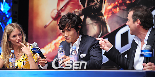 영화 '지.아이.조 : 전쟁의 서막 (감독 스티븐 소머즈ㆍ이하 지 아이 조)'의 배우 이병헌, 채닝 테이텀, 시에나 밀러와 스티븐 소머즈 감독이 29일 오전 서울 중구 장충동 신라호텔 다이너스티홀에서 내한 기자회견을 가졌다. 영화 '지.아이.조'는 가공할 최첨단 무기로 인류를 위협하는 테러 집단 '코브라' 군단과 그에 맞서는 최강 특수 군단 '지.아이.조'의 활약을 그린 액션 블록버스터 영화다. 이 영화로 할리우드에 첫 진출한 한류스타 이병헌은 코브라 군단의 닌자 스톰 쉐도우 역을 맡아 유창한 영어와 화려한 액션 연기로 호평을 받고 있다. 시에나밀러와 스티븐 소머즈 감독이 기자회견중 얘기를 나누고 있다./민경훈 기자 rumi@osen.co.kr