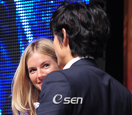 영화 '지.아이.조 : 전쟁의 서막 (감독 스티븐 소머즈ㆍ이하 지 아이 조)'의 배우 이병헌, 채닝 테이텀, 시에나 밀러와 스티븐 소머즈 감독이 29일 오전 서울 중구 장충동 신라호텔 다이너스티홀에서 내한 기자회견을 가졌다. 영화 '지.아이.조'는 가공할 최첨단 무기로 인류를 위협하는 테러 집단 '코브라' 군단과 그에 맞서는 최강 특수 군단 '지.아이.조'의 활약을 그린 액션 블록버스터 영화다. 이 영화로 할리우드에 첫 진출한 한류스타 이병헌은 코브라 군단의 닌자 스톰 쉐도우 역을 맡아 유창한 영어와 화려한 액션 연기로 호평을 받고 있다. 시에나밀러와 이병헌이 기자회견을 마치고 귓속말을 나누고 있다./민경훈 기자 rumi@osen.co.kr
