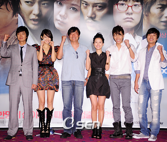 박해일,박희순,신민아,이민기,정유미가 출연하고 조민호 감독이 메가폰을 잡은 스릴러 영화 '10억'의 언론 배급 시사회가 29일 오후 서울 용산CGV에서 열렸다. 상금 십억 원의 서바이벌 게임에 참가한 8명 남녀가 방송 촬영을 위해 떠난 호주에서 목숨을 위협하는 극한 상황 속 게임을 벌이게 된다는 이야기. 다음달 6일 개봉예정이다. 박해일 신민아 조민호감독 정유미 이민기 박희순이 포토타임을 갖으며 파이팅을 외치고 있다./민경훈 기자 rumi@osen.co.kr