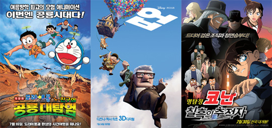 영화 ‘도라에몽: 진구의 공룡대탐험’이 개봉 이후 입소문을 타고 갈수록 높은 흥행세를 보이고 있는 가운데, 이번 주에는 3D 애니메이션 ‘업’과 제패니메이션 ‘명탐정 코난: 칠흑의 추적자’등 애니메이션만 총 3편이 개봉을 앞두고 있어 쟁쟁한 경쟁이 예상되고 있다. 7월 15일에 개봉한 영화 ‘도라에몽: 진구의 공룡대탐험’이 개봉 3주차인 29일까지 총 18만 2000명의 관객을 동원했다(영진위 기준). 평일에도 2만 여명의 관객을 끌어 모으며 이번 주 20만 돌파가 예상되고 있다. 이는 지난해 31만 5000명의 관객을 동원한 ‘도라에몽: 진구의 마계대모험 7인의 마법사’와도 동일한 흥행 추세이다. 개봉 2주차에 약 1만 명이던 평일 관객수가 3주차에 접어들어 2만 명으로 오히려 증가하는 등 갈수록 높아지는 흥행 추이를 보이고 있는 것. ‘도라에몽: 진구의 공룡대탐험’은 이번 주 개봉을 앞둔 애니메이션 ‘업’과 ‘명탐정 코난: 칠흑의 추격자’와 경쟁을 벌일 것으로 예상된다. 영화 ‘업’과 ‘명탐정 코난’이 20대 성인과 마니아를 중심으로 관객층이 형성돼 있는 반면, 영화 ‘도라에몽: 진구의 공룡대탐험’은 저 연령층 어린이들에게 폭발적인 인기를 얻어 각각 차별화된 관객층으로 그 흥행에 관심이 집중되고 있다. crystal@osne.co.kr