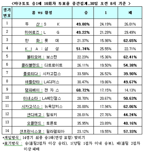 [야구토토] 야구토토 승1패 16회차 투표율 중간 집계 결과…롯데, 한화에 우세 전망 미국프로야구 뉴욕양키스, 보스턴 등 우세 예상…31일 오후 6시 20분 발매마감 국내 야구팬들은 국내프로야구 한화-롯데전에서 원정팀 롯데의 우세를 전망했다. 스포츠토토 온라인 발매사이트인 베트맨(www.betman.co.kr)은 오는 31일(금)부터 다음달 1일(이하 한국시간)까지 벌어지는 국내프로야구 4경기, 미국프로야구 MLB 10경기 등 총 14경기를 대상으로 한 야구토토 승1패 16회차 투표율 중간집계 결과 전체 참가자의 절반이 넘는 62.65%가 롯데가 한화에 완승을 거둘 것으로 전망했다고 밝혔다. 한화의 승리에 투표한 참가자는 21.37%에 머물렀고, 나머지 15.98%는 양팀의 1점차 박빙승부를 전망했다. 이밖에 국내 프로야구에서는 두산(49.80%)과 히어로즈(49.22%), KIA(51.74%)가 각각 SK(26.01%), LG(29.49%), 삼성(22.71%)을 상대로 우세한 경기를 펼칠 것이라는 예상이 다수를 차지했다. ▲뉴욕 양키스, 보스턴 등 명문팀 완승 거둘 것 미국프로야구 메이저리그(MLB)에서는 아메리칸 리그 전통의 강호 뉴욕양키스(62.06%)와 보스턴레드삭스(62.41%)가 나란히 완승을 거둘 것으로 내다봤다. 원정경기를 떠나는 디트로이트(54.38%)를 비롯해 LA에인절스(50.63%), 토론토(40.16%)는 원정의 불리함을 딛고 각각 클리블랜드(26.11%), 미네소타(50.63%), 오클랜드(35.95%)를 상대로 우세한 경기를 펼칠 것으로 전망했다. 반면, 탬파베이-캔자스시티(9경기)전에서는 탬파베이(68.72%)가 캔자스(14.13%)에 압승을 거두고 홈팀의 자존심을 지킬 것으로 집계됐다. 내셔널리그에서는 선두권을 형성하고 있는 LA다저스(49.67%)와 필라델피아(57.33%)의 승리 예상이 많이 나타났다. 이밖에 플로리다-시카고 컵스(7경기)전과 샌디에이고-밀워키(12경기)전에서는 각각 시카고 컵스(39.90%)와 밀워키(44.24%)의 우세를 점쳤다. 한편 이번 야구토토 승1패 16회차 게임은 첫번째 경기 시작 10분전인 31일 오후 6시 20분에 발매를 마감하며 모든 경기가 종료된 후 결과를 공식 발표한다. '즐거운 스포츠, 즐거운 토토'(http://www.betman.co.kr)