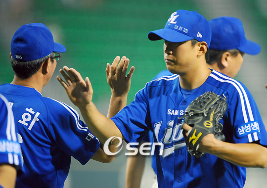 [OSEN=잠실, 박종규 객원기자] “완투승을 한번 쯤 해보고 싶었다”. 후반기 들어 투수들이 집단 난조에 빠진 삼성이 오랜만에 함박웃음을 지었다. 에이스가 홀로 마운드를 지켜 다른 투수들의 휴식을 도왔기 때문이다. 그 주인공은 윤성환(28)이었다. 30일 잠실 LG전에 선발 등판한 윤성환은 9이닝 동안 5안타 무사사구 6삼진 2실점의 호투로 팀의 8-2 승리를 이끌었다. 부산상고-동의대를 거쳐 지난 2004년 데뷔한 이후 첫 완투승이다. 삼성에서 9이닝 완투승은 지난 2006년 4월 30일 광주 KIA전에서 제이미 브라운이 기록한 이후 약 3년 3개월만이다. 지난 2004년에 4승, 2007년에 3승을 거두며 가능성을 보인 윤성환은 지난해 선발 로테이션에 합류해 10승을 거두며 주축 투수로 성장했다. 올시즌 에이스로 떠오른 윤성환은 이날 호투로 시즌 9승(3패)째를 올렸다. 타자들이 1회 공격에서 얻은 5점을 등에 업고 등판한 윤성환은 4회에 2안타와 희생뜬공으로 2점을 허용한 것을 제외하고는 이렇다 할 위기 없이 경기를 마무리했다. 시속 110㎞대의 낙차 큰 커브를 앞세워 5이닝을 삼자범퇴 처리했다. 경기 후, 윤성환은 “컨트롤이 잘 됐다. LG 타자들이 주로 초구와 2구를 쳐준 것이 범타로 이어져 좋은 결과가 나왔다. (현)재윤이형의 볼배합이 좋았다” 며 이날 호투의 비결을 밝혔다. “부담감도 있었는데 타자들이 잘 쳐줘서 2~3점 이내로 막으면 이길 수 있다고 생각했다” 는 말도 덧붙였다. “투수라면 누구나 선발로 나서 완투승을 거두고 싶어한다. 나도 한번 쯤 해보고 싶었다” 라고 말한 윤성환은 “우리 팀 중간계투진이 좋기 때문에 완투 기회가 적지만, 요즘 투타 밸런스가 잘 맞아 이길 수 있었다” 며 기쁨을 감추지 않았다. 자신의 보직에 대해 윤성환은 “예전부터 선발을 원했다. 중간계투로 나서면 두 세 경기를 연속으로 등판 하는 게 힘들다는 것을 알고 있다. 앞으로 긴 이닝을 던지도록 노력하겠다” 며 의지를 드러냈다. 선동렬 감독도 “윤성환이 잘 던져줬고, 초반 기회에서 타자들이 집중력을 발휘해 경기가 잘 풀린 것 같다” 며 만족감을 드러냈다. 완투승을 거둔 삼성 윤성환이 코치진에게 축하를 받고 있다./잠실=윤민호 기자ymh@osen.co.kr