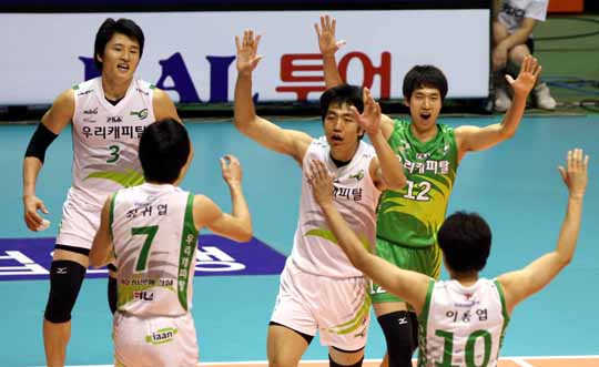 '신생팀' 우리캐피탈이 대한항공을 꺾고 4강에 진출하는 파란을 일으켰다. 삼성화재도 대한항공에 점수득실률에 앞서 4강에 합류했다. 우리캐피탈은 30일 부산 사직체육관에서 열린 2009 IBK 기업은행 국제배구대회 남자부 B조 경기서 신영석(20점)과 손석범(17점)이 맹활약하며 대한항공을 3-1(25-18 25-16 23-25 25-20)로 꺾었다. 이로써 3승 1패를 기록한 우리캐피탈은 조 1위에 올라 2위 삼성화재와 함께 4강에 올랐다. 반면 대한항공(1.095)은 우리캐피탈(1.175)과 삼성화재(1.109)에 점수 득실률이 뒤져 탈락했다. 우리캐피탈은 1세트 초반 3점 차 내외로 끌려갔으나 최귀엽, 손석범 신영석의 공격이 살아나며 7점차로 세트를 따냈다. 우리캐피탈은 이번 대회서 첫 세트를 잃은 대한항공에 공세를 멈추지 않았고 2세트도 9점차로 따냈다. 우리캐피탈은 3세트를 내줬으나 4세트서 신영석과 손석범이 폭발하며 신생팀이 4강 진출을 일궈내는 파란을 일으켰다. 우리캐피탈은 세터 이동엽을 중심으로 공격수들의 고른 득점력을 앞세워 승리를 확정하며 이번 대회 다크호스로 떠올랐다. 승장 김남성 감독은 "준결승 진출도 기쁘지만 국내팀과의 공식경기에서 1승을 했다는 것이 가장 만족스럽다. LIG손해보험과 현대캐피탈 중 어느 팀이 올라오더라도 우리의 플레이를 펼쳐 도전자 입장에서 최선을 다하겠다"고 겸손한 모습을 보였다. 신영석은 "삼성화재전서 득점에서 많은 활약을 하지 못했지만 이 날은 원 없이 공격을 했다. 남은 경기에서도 최선을 다하겠다"고 소감을 밝혔다. 한편 현대캐피탈은 남자부 A조 경기서 박철우(28점)의 맹활약과 블로킹 14개를 앞세워 KEPCO45를 3-1(25-15 16-25 25-22 25-22)로 꺾고 2승 1패로 4강 진출을 확정지었다. KEPCO45는 빌링스가 21점으로 분전했지만 고비때마다 범실을 속출하며 1승 2패로 예선 탈락했다. 현대캐피탈은 31일 이미 4강에 올라 있는 LIG손해보험(2승)과 사이파(2패)의 경기 결과에 따라 조 순위가 결정된다. 현대캐피탈은 1세트를 10점차로 따내며 기분 좋은 출발을 했지만 2세트 KEPCO45의 빌링스의 공격을 막지 못하며 16-25로 세트를 내줬다. 하지만 3세트 박철우가 다시 살아나며 8득점, 61.54% 공격성공률을 기록하며 펄펄 날며 25-22로 가져갔고 승기를 이어 4세트마저 25-22로 따내며 승리를 확정지었다. 고비마다 공격의 강약을 조절하며 월드리그 이후 한 층 더 성숙해진 플레이를 펼친 박철우는 "월드리그에서 블로킹이 높은 외국팀들과 경기가 좋은 경험이 됐다. 준결승에 진출한 만큼 최선을 다해 좋은 경기를 펼치도록 노력하겠다"고 소감을 밝혔다. 여자부 준결승에서는 톈진(중국)이 덴소(일본)를 3-1(21-25 25-22 25-20 27-25)로 누르고 결승에 선착했다. 톈진은 1세트를 먼저 내줬지만 양야난(22점)과 허징(21점)의 폭발적인 공격력을 앞세워 내리 3세트를 따내 역전승했다. parkrin@osen.co.kr KOVO 제공.
