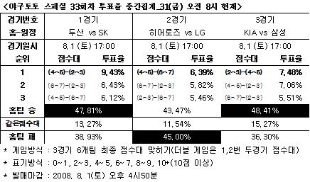 [야구 토토] 대다수 국내 야구팬들은 오는 1일(토) 오후에 벌어지는 2009시즌 국내프로야구 KIA타이거즈-삼성라이온스전에서 KIA의 승리를 전망했다. 스포츠토토 공식 온라인 발매 사이트인 베트맨(www.betman.co.kr)은 오는 1일 오후에 펼쳐지는 두산베어스-SK와이번스, 히어로즈-LG트윈스, KIA타이거즈-삼성라이온스전 등 국내 프로야구 3경기를 대상으로 한 야구토토 스페셜 33회차 투표율 중간집계 결과 전체 참가자의 48.41%가 KIA가 삼성에 우세한 경기를 펼칠 것으로 전망했다고 밝혔다. 36.30%는 원정팀 삼성의 승리를 내다봤고, 나머지 15.27%는 양팀이 같은 점수대를 기록할 것으로 예상했다. 최종 점수대로는 2~3점-4~5점으로 삼성 승리(7.48%)가 가장 많았고, 4~5점-2~3점 KIA 승리(7.06%), 6~7점-2~3점 KIA 승리(5.51%)가 뒤를 이었다. 1경기 두산-SK전은 참가자의 47.81%가 두산의 승리를 예상했고, 38.93%는 원정팀 SK의 우세에 투표했다. 같은 점수대를 예상한 참가자는 13.27%로 나타났다. 최종 점수대로는 4~5점-2~3점으로 두산 승리(9.43%)가 최다를 차지했고, 6~7점-2~3점 두산 승리(6.43%), 4~5점-6~7점 SK 승리(6.12%) 순으로 집계됐다. 2경기 히어로즈-LG전은 45.00%가 LG의 우세를 전망했고, 43.47%는 홈팀 히어로즈의 승리를 예상하는 것으로 나타나 양팀의 치열한 접전을 예고했다. 나머지 11.54%는 같은 점수대를 기록할 것으로 내다봤다. 최종 점수대에서는 4~5점-6~7점 LG 승리가 6.39%로 1순위를 차지했고, 6~7점-2~3점 히어로즈 승리(5.82%), 2~3점-6~7점 LG 승리(5.46%) 순이었다. 베트맨 관계자는 “국내 야구팬들은 주말에 펼쳐지는 KIA-삼성전에서 선두권 등극을 노리는 KIA의 승리를 전망했다” 며 “테이블세터 이용규가 부상에서 복귀하며 탄력을 받고 있는 KIA가 상승세를 타고 있는 삼성을 누르고 상위권 사수에 성공할 수 있을지 야구팬들의 관심이 집중되고 있다” 고 밝혔다. 한편 이번 야구토토 스페셜 33회차 게임은 경기시작 10분 전인 1일(토) 오후 4시 50분에 발매가 마감된다. http://www.betman.co.kr">'즐거운 스포츠, 즐거운 토토'(http://www.betman.co.kr).