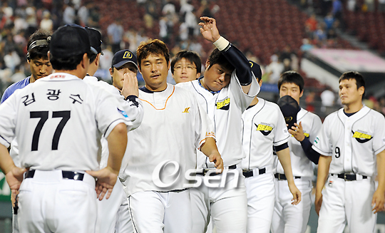 '2009 CJ 마구마구 프로야구' 두산 베어스와 SK 와이번스의 1위 2위간의 잠실벌 선두쟁탈전 경기가 31일 오후 잠실구장에서 벌어졌다. 두산 베어스는 6회 터진 최준석의 역전 결승 쓰리런에 힘입어 6-4 승리를 거둬 SK 와이번스를 제치고 선두로 올라섰다. 승리를 거둔 두산 선수들이 경기장을 나서고 있다./잠실=윤민호 기자ymh@osen.co.kr