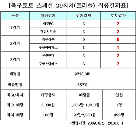 [축구토토] 지난 1일에 벌어진 국내프로축구 K-리그 3경기를 대상으로 한 축구토토 스페셜 29회차 트리플 게임에서 657명의 적중자가 나왔다. 체육진흥투표권 수탁사업자인 스포츠토토㈜(www.sportstoto.co.kr)는 지난 1일 오후에 벌어진 대구FC-대전시티즌(1경기)전, 광주상무-부산아이파크(2경기)전, 울산현대-포항스틸러스(3경기)전등 K-리그 3경기를 대상으로 한 축구토토 스페셜 29회차 트리플 게임에서 3경기의 결과를 정확히 맞힌 참가자가 모두 657명 나와 각각 베팅 금액의 2772.3배에 해당하는 적중상금을 가져가게 됐다고 밝혔다. 대구-대전전, 울산-포항전의 2-2 무승부와 부산의 1-0 승리 등 최종 스코어를 모두 정확히 예측한 이들 적중자 가운데 5000원을 베팅한 축구팬 1명은 이번 회차 최고 상금인 1386만1500원을 가져가는 기쁨을 맛보게 됐다. 최소 베팅금액인 100원을 건 499명에게는 각각 27만7230원씩 돌아간다. 한편 1,2번 경기의 결과만을 맞히는 더블게임에서는 모두 280명의 축구팬이 두경기의 결과를 정확히 맞혀 각각 베팅 금액의 38.5배에 해당하는 적중상금을 받아가게 됐다. 더블 게임 적중자 중 1만원을 건 축구팬 2명은 각각 169만 3000원을 가져가게 된다. 또 최소 베팅금액인 100원을 베팅한 115명은 1만6930원씩을 받게 된다. 스포츠토토 관계자는 "이번 회차에서는 대구와 대전, 울산과 포항이 모두 두골씩을 주고 받으며 무승부를 기록한데다 리그 상위권을 달리고 있는 광주가 약팀 부산에게 덜미를 잡히는 등 많은 변수가 발생한 결과 적중자가 줄어들게 됐다"고 말했다. '즐거운 스포츠, 즐거운 토토'(http://www.betman.co.kr)