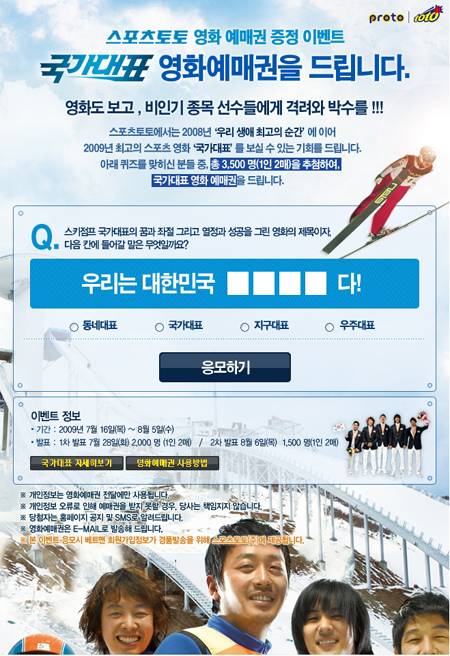 [스포츠 토토] 스포츠토토가 진행중인 영화 '국가대표' 예매권 증정 이벤트가 스포츠팬들의 뜨거운 관심과 성원 속에 그 열기를 더해가고 있다. 체육진흥투표권 수탁사업자인 스포츠토토(www.sportstoto.co.kr)는 스포츠팬들을 대상으로 영화 '국가대표' 관람의 기회를 제공하는 이번 이벤트가 스포츠를 사랑하는 팬들의 응모열기로 조회수 2만 여건을 돌파하는 등 뜨거운 인기몰이를 하고 있다고 밝혔다. 영화 '국가대표'는 열악한 환경 속에서도 꿋꿋이 세계 정상을 향해 도전하는 스키점프 국가대표의 꿈과 좌절. 열정과 성공의 이야기를 담은 작품으로써 지난달 29일 개봉해 뜨거운 관심을 받고 있는 작품이다. 총 3500명(1인 2매)의 스포츠팬들에게 행운이 돌아가는 영화 '국가대표' 예매권 응모 이벤트에 참가를 원하는 스포츠팬은 오는 5일까지 스포츠토토 홈페이지(www.sportstoto.co.k)나 스포츠토토 공식 발매 사이트인 베트맨(www.betman.co.kr)을 방문해 이벤트 페이지 접속한 후 간단한 퀴즈를 풀면 된다. 2000명을 선정한 1차 당첨자발표(7월 28일 발표)에 이어 오는 6일(목)에 1500명(1인2매)을 추가 발표하며, 스포츠토토 및 베트맨 홈페이지와 문자메시지(SMS)를 통해 당첨 결과가 통보된다. 스포츠 토토 제공. '즐거운 스포츠, 즐거운 토토'(http://www.betman.co.kr)