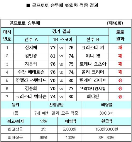[골프토토] LPGA '리코 브리티시 여자 오픈' 1라운드를 대상으로 한 골프토토 승무패 게임 48회차에서 총 161명의 적중자가 나왔다. 체육진흥투표권 수탁사업자인 스포츠토토(www.sportstoto.co.kr)는 지난달 30일 부터 31일까지 영국 랭커셔에서 벌어진 LPGA '리코 브리티시 여자 오픈' 1라운드를 대상으로 한 골프토토 승무패 48회차 게임에서 7개의 매치 결과를 정확히 맞힌 골프팬이 모두 161명 나와 각각 베팅금액의 300.6배에 해당하는 적중상금을 가져가게 됐다고 밝혔다. 상금랭킹 순으로 14명을 선정, 2명씩 7개 매치로 나눠 각 매치별로 1라운드 최종 승무패를 예상하는 방식으로 진행된 이번 게임에서는 신지애-크리스티 커(패), 김인경-야니 챙(패), 지은희-로레나 오초아(패), 수잔 페테르손-폴라 크리머(패), 안젤라 스탠퍼드-린제이 라이트(승), 김송희-브리타니 린시컴(승), 크리스티 맥퍼슨-최나연(승) 등의 결과가 나왔다. 각 매치의 승-무-패를 정확히 맞힌 적중자들 가운데 5천원을 베팅한 3명의 골프팬은 이번 회차 최고액인 150만 3,000원의 상금을 가져가는 기쁨을 맛보게 됐다. 또한 최소 베팅액인 100원을 베팅한 99명의 적중자들에게는 각각 3만 60원의 상금이 각각 지급된다. 한편 같은 날 미국 미시간에서 열린 PGA 뷰익 오픈을 대상으로 한 골프토토 승무패 49회차에서는 타이거우즈-브라이언게이(1번 매치)전과 존 롤린스-벤 크레인(4번 매치)전에서 모두 무승부가 나오는 등 다양한 변수가 발생하며 단 8명의 적중자를 배출하는데 그쳤다. '즐거운 스포츠, 즐거운 토토'(http://www.betman.co.kr)
