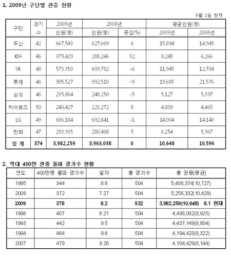 후반기 개막과 함께 치열한 순위 싸움으로 갈수록 흥미를 더하고 있는 2009 CJ 마구마구 프로 야구가 400만 관중 돌파를 눈 앞에 두고 있다. 올 시즌 프로야구는 1일 현재 전체 532경기 중 일정의 70%인 374경기가 진행된 가운데 총 관중 398만2259명을 기록하며(평균 1만648명) 400만 관중에 1만7741명 만을 남겨 놓고 있다. 지난 6월 27일 285경기만에 300만 관중을 돌파했던 2009 프로야구는 장마로 인해 잠시 관중 증가세가 주춤하였으나 후반기 들어 다시 뜨거운 열기를 회복, 전년대비 1만9221명이 증가하며, 관중 증가세에 가속도를 붙여 가고 있다. 한편, 2009 프로야구는 2일 378경기만에 400만 관중을 돌파하게 되면, 역대 최다 관중(540만명)을 기록하였던 1995년(344경기)과 두번째로 500만 관중을 넘어섰던 2008년(372경기)에 이어 역대 3번째로 최소 경기 400만 관중을 기록하게 되고, 2007년부터 3년 연속 400만 이상 관중 기록을 이어가게 된다. what@osen.co.kr