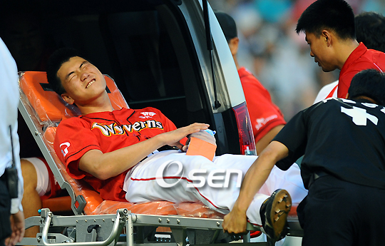 '좌완 에이스' 김광현(21. SK 와이번스)이 타구에 왼손을 맞아 앰뷸런스에 실려 병원으로 후송되었다. 김광현은 7-4로 앞선 3회말 선두 타자 김현수(21)를 상대하던 도중 4구 째를 던진 후 자신을 향해 날아 든 강습 타구에 왼손을 맞고 고통을 호소하다 쓰러졌다. 심한 통증을 호소하며 그라운드에 누운 김광현은 경기장으로 진입한 앰뷸런스에 실려 인근 서울 의료원으로 후송되었다. SK는 부랴부랴 좌완 고효준(26)을 마운드에 올렸다. SK의 구단 관계자는 "왼손 검지와 중지 부위에 타구를 맞았다"라고 밝혔다. 공을 잡아채는 부위에 강습당한 만큼 만일 골절 이상의 중상으로 판명될 경우 SK는 올 시즌 엄청난 전력 손실을 입게 될 가능성이 크다. farinelli@osen.co.kr '2009 CJ 마구마구 프로야구' 두산 베어스와 SK 와이번스의 경기가 2일 오후 잠실구장에서 벌어졌다. 3회말 무사 두산 선두타자 김현수의 직선타에 손을 맞고 쓰러진 SK 김광현이 고통스러워하며 엠블러스로 이송되고 있다./잠실=윤민호 기자ymh@osen.co.kr