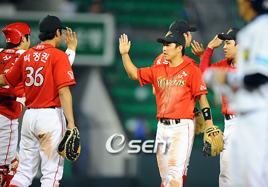 '2009 CJ 마구마구 프로야구' 두산 베어스와 SK 와이번스의 경기가 2일 오후 잠실구장에서 벌어졌다. SK 와이번스는 에이스 김광현의 부상 이탈에도 불구, 김강민의 맹타와 뒤를 이어 5이닝 무실점으로 호투한 좌완 고효준의 역투에 힘입어 11-4로 승리를 거뒀다. SK 선수들이 마운드에 모여 승리를 자축하고 있다./잠실=윤민호 기자ymh@osen.co.kr