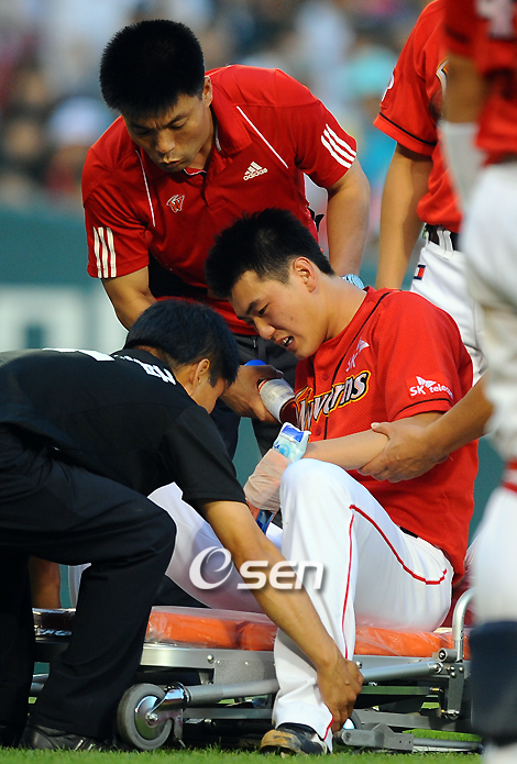 '좌완 에이스' 김광현(21. SK 와이번스)이 결국 왼 손등에 금이 가는 부상으로 사실상 페넌트레이스 출장은 어렵게 되었다. 지난 2일 잠실 두산 전 3회말서 김현수(21)의 직선 타구에 왼 손등을 강타당해 병원으로 후송되었던 김광현은 3일 오후 인하대 병원서 MRI 정밀 검진을 받은 결과 '중수골 기저부 선상골절'로 판명되았다. 왼손 중지와 손등이 이어지는 부위에 금이 간 것. SK 구단 관계자는 "일단 3주 진단이 나왔고 공을 던지기 까지는 한 달 반 정도의 기간이 소요될 전망이다. 4일 삼성 의료원에서 다시 한 번 정밀 검진을 받을 계획"이라고 밝혔다. 그러나 2차 정밀 검진서도 똑같은 진단이 나올 경우 이는 '디펜딩 챔피언' SK에 엄청난 손실이 예상된다. 올 시즌 SK는 이승호(28)-윤길현(26)-정우람(24)-정대현(31) 등 주요 계투 요원들이 예년 만큼의 위력을 보여주지 못하며 어려운 시즌을 치렀다. 게다가 선발과 게투를 오갈 수 있는 우완 채병룡(27)마저 부상으로 이탈, 다음 시즌 군입대를 준비하고 있는 상황. SK 전력의 반이라고 봐도 과언이 아니던 포수 박경완(37)마저 아킬레스건 부상으로 쓰러졌다. 여기에 우완 송은범(25)과 원투펀치를 구축하며 선발진을 이끌었던 김광현마저 부상으로 이탈한 것은 팀에 치명적으로 다가올 가능성이 크다. 특히 공을 잡아채는 부위에 부상을 입은 만큼 이는 국내 최고 좌완 중 한 명으로 자리매김한 김광현 개인에게도 악재가 아닐 수 없다. farinelli@osen.co.kr 지난 2일 잠실 두산-SK전 3회말 무사 두산 선두타자 김현수의 직선타에 손을 맞고 쓰러진 SK 김광현이 고통스러워하며 엠블런스로 이송되고 있다./윤민호 기자ymh@osen.co.kr