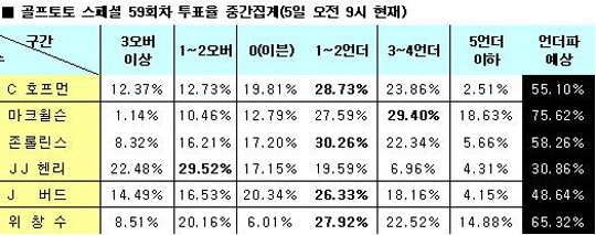 [골프토토] 국내 골프팬들은 PGA투어 레전드 리노-타호 오픈에서 마크 윌슨의 맹활약을 점치고 있는 것으로 나타났다. 체육진흥투표권 수탁사업자인 스포츠토토(www.sportstoto.co.kr)는 오는 6일 미국 네바다에서 개최되는 미국프로골프(PGA)투어 레전드 리노-타호 1라운드를 대상으로 한 골프토토 스페셜 59회차에서 75.62%의 참가자들이 더 메모리얼 토너먼트에서 3위를 기록한 마크 윌슨의 언더파 활약을 예상했다고 밝혔다. 상금랭킹 48위 위창수와 32위 존 롤린스, 29위 찰리 호프먼은 각각 65.32%, 58.26%, 55.10%의 참가자가 언더파를 예상했다. 반면 지난 더 메모리얼 토너먼트에서 공동 3위를 기록한 조나단 버드(48.64%)와 존 디어 클래식에서 5위를 기록한 JJ 헨리(30.86%)는 1라운드 언더파 예상이 50% 이하에 그쳤다. 지정선수별 1라운드 예상 스코어는 마크 윌슨의 경우 3~4언더파 예상이 29.40%로 가장 많았고 찰리 호프먼(28.73%), 존 롤린스(30.26%), 조나단 버드(26.33%), 위창수(27.92%)의 경우 다수의 골프팬들이 1라운드 1~2언더파를 점쳤다. 반면 JJ 헨리는 29.52%의 참가자가 1~2오버파를 점쳤다. 한편 이번 골프토토 스페셜 59회차 게임은 6일 오후 9시 50분에 발매 마감되며 공식 적중결과는 7일 발표된다. '즐거운 스포츠, 즐거운 토토'(http://www.betman.co.kr)