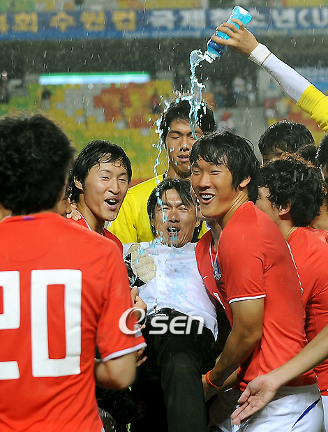 홍명보 감독이 이끄는 한국이 일본과 6일 저녁 수원 월드컵경기장에서 제4회 수원컵 국제청소년(U-20)대회 3차전 경기를 가졌다. 한국은 조영철의 화려한 개인기와 최정한,이승렬의 골으로 2-1 승리를 거뒀다. 이로써 한국은 지난 2003년 창설된 이 대회서 2007년을 제외하곤 3차례 모두 우승컵을 거머쥐게 됐다. 한국 선수들이 홍명보 감독을 헹가래 치기 위해 들고 있다./수원=윤민호 기자ymh@osen.co.kr