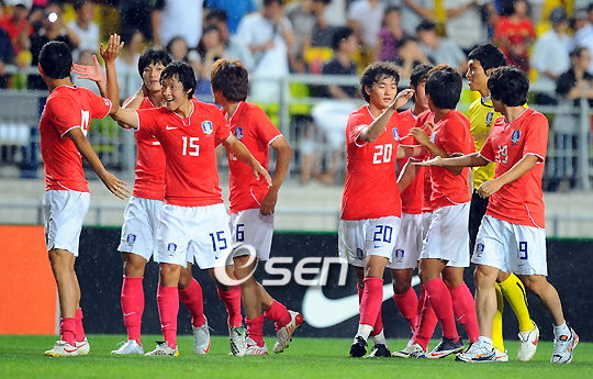 홍명보 감독이 이끄는 한국이 일본과 6일 저녁 수원 월드컵경기장에서 제4회 수원컵 국제청소년(U-20)대회 3차전 경기를 가졌다. 한국은 조영철의 화려한 개인기와 최정한,이승렬의 골으로 2-1 승리를 거뒀다. 이로써 한국은 지난 2003년 창설된 이 대회서 2007년을 제외하곤 3차례 모두 우승컵을 거머쥐게 됐다. 경기 종료 직후 한국 선수들이 기뻐하고 있다./수원=윤민호 기자ymh@osen.co.kr