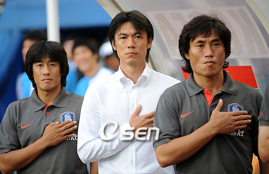 홍명보 감독이 이끄는 한국이 일본과 6일 저녁 수원 월드컵경기장에서 제4회 수원컵 국제청소년(U-20)대회 3차전 경기를 가졌다. 한국은 조영철의 화려한 개인기와 최정한,이승렬의 골으로 2-1 승리를 거뒀다. 이로써 한국은 지난 2003년 창설된 이 대회서 2007년을 제외하곤 3차례 모두 우승컵을 거머쥐게 됐다. 경기 전 서정원 코치, 홍명보 감독, 김태영 코치가 국기에 대한 경례를 하고 있다./수원=윤민호 기자ymh@osen.co.kr