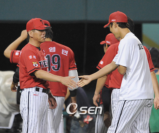 '2009 CJ 마구마구 프로야구' LG 트윈스와 KIA 타이거즈 경기가 6일 잠실 경기장에서 열려 KIA 선발 윤석민의 호투와 김상현,김원섭,안치홍의 홈런에 힘입어 장단 16안타를 터트리며 11-6으로 승리하며 7연승 행진을 이어갔다. 조범현 감독이 선발 승리를 따낸 윤석민과 악수를 하며 축하를 해주고 있다./잠실=김영민 기자ajyoung@osen.co.kr