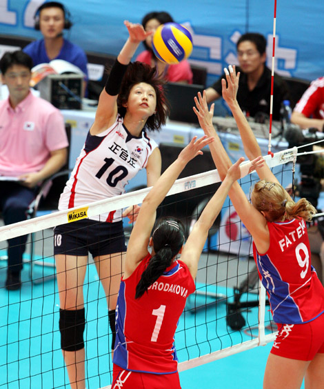 여자배구 대표팀이 러시아의 '벽'에 아깝게 무너졌다. 한국은 7일 저녁 4시 30분 일본 오사카 시립체육관에서 열린 2009 그랑프리 세계여자 배구대회 F조 1차전에서 풀세트까지 가는 접전 끝에 세트스코어 2-3(25-23 20-25 18-25 27-25 13-15)으로 석패했다. 이에 따라 한국은 이번 대회 4전 전패를 기록하는 수모를 겪었다. 또한 지난달 31일 1차전에 이어 러시아에 또 한 번 패하는 아쉬움을 겪었다. 한국은 러시아에 지난 2004년 올림픽예선전에서 3-2로 이긴 뒤 5연패를 기록하게 됐다. 이날 한국은 김연경(27점)이 초반 공격을 이끌면서 선전했으나 중반부터 러시아의 '높이'를 넘지 못하면서 아깝게 패했다. 그러나 김연경과 김민지(14점) 외에는 마땅한 공격 루트를 찾지 못하던 한국은 양효진(13점 4블로킹)이 살아나면서 위안을 삼게 됐다. 기선을 먼저 제압한 쪽은 한국이었다. 김연경의 호쾌한 공격을 앞세운 한국은 러시아에 15-9로 앞섰다. 러시아는 잦은 실책까지 겹치면서 제 기량을 발휘하지 못했고 첫 세트는 한국이 가져갔다. 그러나 한국의 기세는 2세트에서 무너졌다. 타티아나 코셀레바와 에카테리나 가모바를 막지 못하면서 주도권을 내준 한국은 7-7 동점에서 순식간에 11-18로 뒤지면서 2세트를 러시아에 뺏겼다. 기세가 오른 러시아에 한국은 3세트에서도 고전을 면치 못했다. 한국도 김민지를 중심으로 분전했지만 3세트 역시 러시아의 몫이었다. 하지만 한국의 저력도 만만치 않았다. 4세트에서 러시아와 팽팽한 시소게임을 벌인 한국은 두 차례의 듀스까지 가는 접전 끝에 27-25로 승리하며 마지막 희망을 살렸다. 그러나 한국은 마지막 고비를 넘지 못했다. 김연경을 중심으로 러시아와 맞대결을 벌인 한국은 4-9로 뒤진 상황에서 13-13까지 쫒아가는 끈질긴 면모를 보였지만 두 점을 내리 허용하면서 아깝게 패하고 말았다. 한편 한국은 8일 같은 장소에서 일본과 F조 2차전을 치른다. stylelomo@osen.co.kr