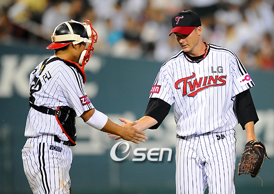 [OSEN=잠실, 박종규 객원기자] “제구력도 중요하지만, 정면 승부를 즐기는 편이다”. LG 트윈스의 대체 외국인 투수 제레미 존슨(27)이 눈부신 호투로 한국 팬들에게 어필했다. 지난달 22일 영입된 존슨은 지난 1일 목동 히어로즈전 6⅓이닝 3실점으로 가능성을 보인 뒤, 7일 잠실 두산전에 두 번째로 선발 등판해 8이닝 무실점으로 첫 승을 거뒀다. 존슨은 7연패에 빠진 LG를 극적으로 구해낸 영웅이 됐다. 그것도 3연승의 상승세를 타던 잠실 라이벌 두산을 상대로 거둔 승리였다. 존슨의 호투는 눈부셨다. 140㎞ 중반의 빠른 공을 바탕으로 주무기인 커브가 예리하게 떨어졌다. 올시즌 두 번째로 선발 출장한 프로 2년차 포수 김태군의 공격적인 리드도 효과를 발휘했다. 직구를 주로 요구하며 두산 타선에 힘 대결에서 우위를 점했다. 제대로 힘이 실려 날아가는 타구가 거의 없었다. 존슨은 8회까지 6안타를 맞았지만 말 그대로 ‘산발’ 이었다. 2~4회와 6~8회에 각각 1안타씩만을 허용하고 후속 타자들을 범타로 처리하며 이렇다 할 위기도 없었다. 결국 8이닝 동안 100개의 공을 던져 6안타 무사사구 7삼진 무실점이라는 성적으로 팀의 2-0 승리를 이끌었다. 경기 후 존슨은 “첫 경기(1일)보다 제구가 잘 됐다. 그 때는 2주간의 공백 때문에 경기 감각이 없었는데, 오늘(7일)은 감을 찾았다” 며 달라진 컨디션에 대해 설명했다. 타자들과 승부에 대해서는 “코너워크를 지나치게 의식하다 보면 볼카운트가 늘어난다. 제구력도 중요하지만, 정면 승부를 즐기는 편이다” 라고 말했다. 이렇다 할 위기가 없었다는 말에 “위기가 와도 다음 타자와 승부를 잘 하면 병살타로 연결될 수도 있다. 긍정적인 생각으로 타석의 타자와 승부에 집중했다” 고 말한 존슨은 “커브를 결정구로 삼아 삼진을 잡았다” 고 말을 이었다. 이날 배터리를 이룬 김태군에 대해서는 “공을 빠뜨리지 않아 안정적이었다. 움직임도 적극적이었고, 젊은 선수인 만큼 허슬 플레이가 좋다” 고 칭찬했다. 앞으로의 전망에 대해서는 “남은 시즌에 꾸준히 경기에 나서 퀄리티 스타트를 기록하는 게 목표다. 계속 좋은 모습이면 내년 시즌에도 팀에서 나에게 기회를 주지 않을까 생각한다” 는 희망을 가지고 있음을 드러냈다. '2009 CJ 마구마구 프로야구' LG 트윈스와 두산 베어스의 잠실 라이벌 경기가 7일 오후 잠실구장에서 벌어졌다. 6이닝 무실점으로 수비를 마친 LG 존슨이 김태군과 손을 맞대며 마운드를 내려오고 있다./잠실=윤민호 기자ymh@osen.co.kr