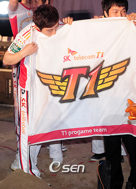 '신한은행 프로리그 08-09' 올스타 2차전 및 SK텔레콤과 화승오즈의 결승 2차전이 8일 오후 부산 광안리 해수욕장 특설무대에서 열렸다. 이 날 결승 경기에서 SK텔레콤은 5-4로 승리를 거두며 '신한은행 프로리그 08-09' 우승을 차지했다. SK텔레콤 선수들이 우승 세레모니를 하던 중 임요환이 T1 깃발에 키스를 하고 있다./부산=민경훈 기자 rumi@osen.co.kr