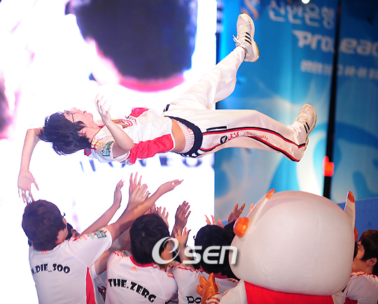'신한은행 프로리그 08-09' 올스타 2차전 및 SK텔레콤과 화승오즈의 결승 2차전이 8일 오후 부산 광안리 해수욕장 특설무대에서 열렸다. 이 날 결승 경기에서 SK텔레콤은 5-4로 승리를 거두며 '신한은행 프로리그 08-09' 우승을 차지했다. 경기를 마치고 MVP 정명훈이 SK텔레콤 동료들에게 헹가레를 받고 있다./부산=민경훈 기자 rumi@osen.co.kr