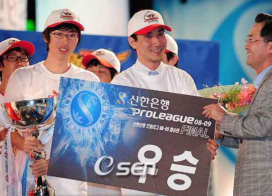 '신한은행 프로리그 08-09' 올스타 2차전 및 SK텔레콤과 화승오즈의 결승 2차전이 8일 오후 부산 광안리 해수욕장 특설무대에서 열렸다. 이 날 결승 경기에서 SK텔레콤은 5-4로 승리를 거두며 '신한은행 프로리그 08-09' 우승을 차지했다. 경기를 마치고 SK텔레콤 박용운 감독과 MVP 정명훈이 우승트로피를 받고 있다. /부산=민경훈 기자 rumi@osen.co.kr