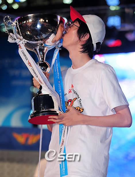 '신한은행 프로리그 08-09' 올스타 2차전 및 SK텔레콤과 화승오즈의 결승 2차전이 8일 오후 부산 광안리 해수욕장 특설무대에서 열렸다. 이 날 결승 경기에서 SK텔레콤은 5-4로 승리를 거두며 '신한은행 프로리그 08-09' 우승을 차지했다. 경기를 마치고 MVP로 뽑힌 SK텔레콤 정명훈이 우승트로피에 키스를 하고 있다. /부산=민경훈 기자 rumi@osen.co.kr