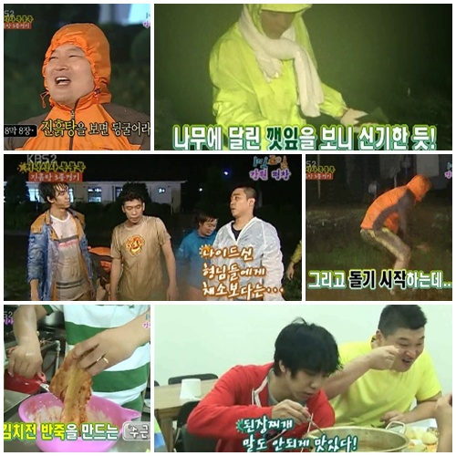 KBS 2TV '해피 선데이- 1박 2일'이 갈수록 리얼해지고 있다. 본래 '리얼 야생 버라이어티'를 표방하고 나서긴 했지만 이토록 독하게 리얼할 수 있을까? 9일 방송된 '해피선데이-1박 2일'에서는 지난주에 이어 강원도 평창으로 농가 체험을 떠난 멤버들의 파란만장기가 펼쳐졌다. 마침 폭우를 만난 탓에 촬영 내내 멤버들은 땀과 빗물에 절어야 했다. 촬영이 불가능할 정도로 쏟아지는 폭우 속에도 우비 하나에 의지해 진흙탕에 몸을 던지는 멤버들의 분투는 역시 타의 추종을 불허했다. '버라이어티 정신'을 외치며 웃기겠다는 일념하나로 몸 개그를 펼치는 장면들이 보기에 안타까울 정도였다. 또 도시 생활에 익숙한 멤버들이 양파와 감자 같은 농작물을 직접 캐면서 아이처럼 신기해하는 모습은 시청자들의 입가에 미소를 번지게 했다. 동시에 이번 여행의 콘셉트인 '농가 체험'의 실제 매력을 전달하며 여름방학용 유익한 정보도 제공했다. 스튜디오에 앉아 말장난을 일삼는 예능들의 한계점이 드러난 지는 이미 오래다. '1박 2일'과 유사한 포맷을 갖춘 '해피 선데이'의 또 다른 코너 '남자의 자격' 역시 자꾸만 밖으로 나가 이야기를 만든다. '천하무적 토요일-천하무적 야구단'도 마찬가지다. MBC의 최고 인기 예능 '무한도전'은 야외건 스튜디오 건 구분 없이 리얼 버라이어티를 시도해 정상에 올라선 원조 격이나 다름없다. '1박 2일'의 멤버들은 늘 카메라 앞에 생얼을 공개하고 생리현상도 마다치 않으며 멤버들의 사생활도 여과 없이 전파를 탄다. 침 흘리며 자는 모습, 엉덩이가 바지를 잡아먹은 모양새 등 꾸밈없는 모습은 이제 시청자들에게 아무런 거부감 없이 어필한다. 이러한 점에서 '1박 2일'은 리얼 버라이어티의 모범답안을 제시하며 갈수록 리얼한 재미를 추구하고 있다. 물론 앞서 열거한 프로그램들도 비슷한 스타일로 시청자들의 마음을 움직이고 있는 상황이다. 하지만 폭우도 멈추지 못하는 멤버들의 버라이어티 정신, 어떤 극한도 견디며 이어가고 있는 야외취침, 그 속에 빵 터지는 웃음 코드와 소소한 여행 정보가 함께하는 '1박 2'은 단연 독보적이다. 강호동이 늘 부르짖는 '예능의 정석'처럼 당분간 예능의 모범생으로, 길잡이로 꾸준히 자리매김할 것에 다수가 이견이 없다. issue@osen.co.kr