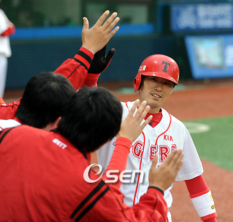 KIA가 역대 4번만 나왔던 극적인 역전 끝내기 그랜드슬램으로 연승행진을 '9'로 늘렸다. 야구를 자주 접하지 못하던 군산시민들은 그야말로 최고의 함성을 올렸다. KIA는 9일 1만1000석이 꽉찬 군산 월명구장에서 열린 2009 CJ 마구마구 프로야구 SK와의 홈경기에서 3-2로 뒤진 9회말 2사에서 김원섭의 역전 끝내기 만루홈런을 앞세워 6-3으로 짜릿한 역전승을 거뒀다. 김원섭은 2사 만루에서 SK 마무리 정우람의 초구를 노려쳐 우측 담장을 훌쩍 넘기는 그랜드슬램을 터뜨렸다. 역전 끝내기 만루홈런은 올 시즌 LG 페타지니에 이어 두 번째이자 통산 4번째다. 김원섭에게는 첫 경험이다. 3-2로 뒤진 9회 공격에 나선 KIA는 2사 후 대타로 나온 김상훈이 SK 김원형으로부터 볼넷을 얻어내 불씨를 지폈다. 이어 이현곤 볼넷, 이용규 볼넷으로 만루 기회를 만들어 역전 분위기를 마련했다. 이로써 지난달 30일 사직 롯데전 이후 9연승을 달린 KIA는 시즌 57승(37패 4무)째를 거뒀다. SK전 3연승과 홈 7연승을 동시에 기록한 승리이기도 했다. 반면 아웃카운트 1개를 남기고 다잡은 승리를 놓친 SK는 3연패에 빠지며 시즌 42패(55승)째를 기록했다. 전날에 이어 이날도 KIA가 먼저 기세를 올렸다. KIA는 1회 톱타자 이용규의 우중간 2루타로 포문을 연 2사 3루 찬스에서 최희섭의 2루수 내야안타로 선취점을 올렸다. 계속된 공격에서 전날 3연타석 홈런을 날린 김상현이 우측 2루타 때 최희섭이 홈으로 파고 들며 추가점을 노렸지만 태그아웃돼 아쉬움으로 남았다. 그러자 곧바로 SK가 반격에 나섰다. SK는 2회 나주환의 우중간 안타, 박정권의 우전안타로 만든 무사 1, 3루에서 유격수 실책 속에 동점에 성공했다. 김연훈이 친 평범한 타구를 잡은 KIA 유격수 김선빈이 병살플레이를 위해 공을 던지는 과정에서 축이 되는 오른발이 미끄러졌다. 김선빈은 곧바로 이현곤과 교체됐다. SK는 1-1로 맞선 4회 역전에 성공했다. 정상호가 3루수 실책으로 출루하며 찬스를 열었고 2사 1루에서 김연훈의 좌중간 2루타가 터져나왔다. 또 곧바로 김강민의 중전적시타가 나오며 추가점까지 올렸다. KIA는 3-1로 뒤진 8회 1사 만루 기회에서 최희섭의 중견수 희생플라이로 1점을 추가, 대역전극 분위기를 준비했다. 한편 이날 경기가 열린 월명야구장은 전날에 이어 다시 한 번 매진을 기록했다. 전날에는 입석표 1000석까지 포함해 1만2000석이 팔려나갔고 이날은 1만1000개의 좌석이 매진됐다. letmeout@osen.co.kr 김원섭.