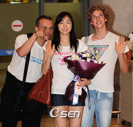 캐나다에서 전지훈련 중이던 '피겨' 김연아(19·고려대)가 '삼성 애니콜 하우젠 아이스올스타즈 2009' 참가를 위해 11일 새벽에 인천 공항을 통해 입국했다. 오는 14일부터 16일 동안 열리는 서울 올림픽 체조 경기장에서 열리는 이 아이스 쇼에서 김연아는 그녀의 '우상'인 미셸 콴과 한 무대에 서게 되어 개최 전부터 큰 화제를 낳고 있다. 김연아가 공항 입국장에서 아담 리폰 선수와 함께 인사할때 안무가 데이비드 윌슨(왼쪽)이 시선 방향을 말해주고 있다. /인천공항=민경훈 기자 rumi@osen.co.kr