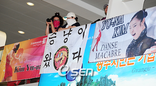 캐나다에서 전지훈련 중이던 '피겨' 김연아(19·고려대)가 '삼성 애니콜 하우젠 아이스올스타즈 2009' 참가를 위해 11일 새벽에 인천 공항을 통해 입국했다. 오는 14일부터 16일 동안 열리는 서울 올림픽 체조 경기장에서 열리는 이 아이스 쇼에서 김연아는 그녀의 '우상'인 미셸 콴과 한 무대에 서게 되어 개최 전부터 큰 화제를 낳고 있다. 김연아 팬들이 공항 2층 난간에서 김연아를 기다리고 있다./인천공항=민경훈 기자 rumi@osen.co.kr
