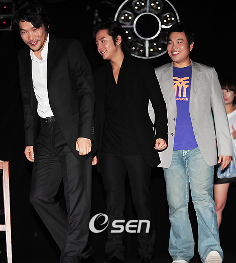 정진영 장근석 신승환이 출연하고 홍기선 감독이 메가폰을 잡은 미스터리 스릴러 영화 '이태원 살인사건' 의 기자간담회가 11일 서울 강남구 신사동 압구정 예홀에서 열렸다. 이 영화는 실제 1997년 이태원 햄버거가게에서 일어났던 엽기적인 살인사건을 다룬 영화로 개봉전부터 제2의 '살인의 추억'이라는 말과 함께 큰 화제를 모으고 있다. 배우 정진영 장근석 신승환이 무대로 걸어나오며 인사를 하고 있다./민경훈 기자 rumi@osen.co.kr