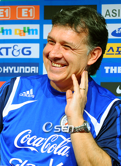 허정무(54) 대표팀 감독이 오는 12일 오후 8시 서울월드컵경기장에서 열리는 파라과이와 경기를 하루 앞두고 오후 서울월드컵경기장에서 이영표(32, 알힐랄) 헤라르도 마르티노(46) 파라과이 감독, 넬손 아에도 발데스(27, B.도르트문트)가 참석한 가운데 공식 기자회견을 가졌다. 기자회견에 참석한 헤라르도 마르티노 감독이 미소를 짓고 있다./상암=윤민호 기자ymh@osen.co.kr