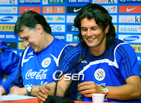 허정무(54) 대표팀 감독이 오는 12일 오후 8시 서울월드컵경기장에서 열리는 파라과이와 경기를 하루 앞두고 오후 서울월드컵경기장에서 이영표(32, 알힐랄) 헤라르도 마르티노(46) 파라과이 감독, 넬손 아에도 발데스(27, B.도르트문트)가 참석한 가운데 공식 기자회견을 가졌다. 기자회견에 참석한 발데스가 웃음 짓고 있다./상암=윤민호 기자ymh@osen.co.kr