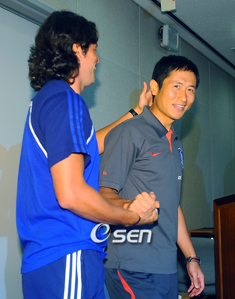 허정무(54) 대표팀 감독이 오는 12일 오후 8시 서울월드컵경기장에서 열리는 파라과이와 경기를 하루 앞두고 오후 서울월드컵경기장에서 이영표(32, 알힐랄) 헤라르도 마르티노(46) 파라과이 감독, 넬손 아에도 발데스(27, B.도르트문트)가 참석한 가운데 공식 기자회견을 가졌다. 지난 시즌까지 팀 동료였던 발데스와 이영표가 반갑게 인사를 하고 있다./상암=윤민호 기자ymh@osen.co.kr