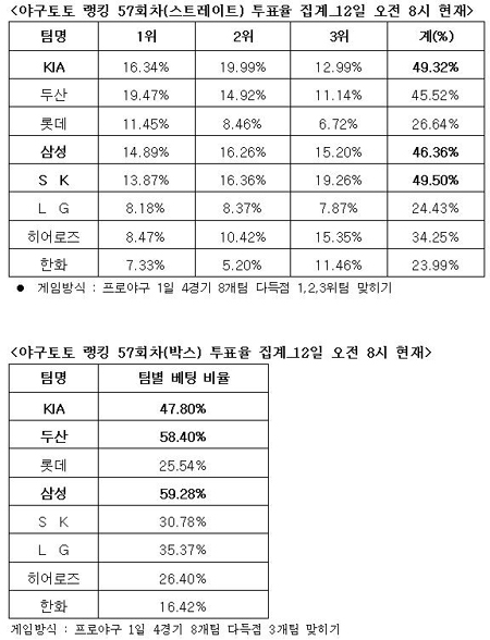 [야구토토] 야구팬들은 13일에 열리는 야구토토 랭킹 57회차 게임 대상 8개팀 가운데 SK, KIA, 삼성의 다득점을 예상하고 있는 것으로 나타났다. 스포츠토토 공식발매 사이트인 베트맨(www.betman.co.kr)은 13일에 개최되는 두산-한화, 히어로즈-삼성, SK-LG, KIA-롯데전 등 4경기 8개팀을 대상으로 한 야구토토 랭킹 57회차 스트레이트 게임 중간집계 결과 SK(49.50%), KIA(49.32%), 삼성(46.36%)을 다득점 상위 3개팀으로 꼽았다고 밝혔다. 반면 한화와 LG는 각각 23.99%와 24.43%를 득표해 다득점 가능성이 가장 낮은 것으로 나타났다. 순위에 상관없이 다득점 3개팀만을 맞히는 '박스' 게임에서는 삼성(59.28%)이 최다득표를 기록한 가운데, 두산(58.40%), KIA(47.80%)가 뒤를 이었다. 반면 한화(16.42%)와 히어로즈(26.40%)는 리그 8개 팀 중 가장 적은 득점을 기록할 것으로 내다봤다. 베트맨 관계자는 "국내 야구팬들은 주중 프로야구 경기를 대상으로 발행하는 야구토토 랭킹 게임에서 디펜딩 챔피언 SK 최다득점을 전망했다"며 "최근 부진을 보이고 있는 SK가 하위권에서 허덕이는 LG를 상대로 다득점에 성공할 수 있을지 야구팬들의 관심이 집중되고 있다"고 밝혔다. 한편 야구토토 랭킹 57회차 게임은 경기 시작 10분 전인 13일 오후 6시 20분에 발매가 마감되며, 경기가 모두 종료된 후 적중결과가 공식 발표된다. '즐거운 스포츠, 즐거운 토토'(http://www.betman.co.kr)
