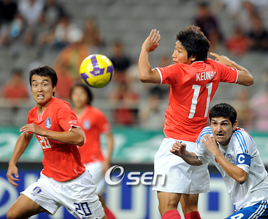 '절반의 성공'을 거둔 이동국이 프리미어리거 듀오인 박지성-이청용과 함께 할 수 있을까?. '남미 킬러' 허정무 감독이 이끄는 대표팀은 지난 12일 서울 상암월드컵경기장에서 열린 국제축구연맹(FIFA) 랭킹 20위의 파라과이와 친선경기서 승리를 거두며 2010 남아공월드컵 본선서 16강 진출 전망을 밝혔다. 이날 경기서 가장 큰 관심을 끈 대상은 2년 여 만에 대표팀에 복귀한 '라이언킹' 이동국(전북)이었다. 올 시즌 K리그서 폭발적인 득점력을 선보이고 있는 이동국은 많은 기대 속에 대표팀에 합류했고 파라과이전에 선발 출장하며 시험 무대에 올랐다. 이동국은 전반 1분 만에 파라과이 진영 페널티아크 오른쪽 10여m 지점에서 첫 슈팅을 날렸지만 골대를 한참 빗나갔다. 기선 제압을 위한 그의 슈팅은 굴절되고 말았지만 공격적으로 나서겠다는 의지을 발로였다. 전방에서 활발한 플레이를 위해 움직임을 보였던 이동국은 전반 26분 득점 기회를 맞았다. 김치우가 페널티지역 바깥에서 올린 프리킥을 헤딩슈팅으로 연결했지만 상대 골키퍼인 후스토 비야르의 선방에 막혔다. 또 이동국은 36분에는 상대 왼쪽 측면으로 공을 몰고 가다 페널티 아크 정면의 기성용에게 패스해 주면서 결과적으로 프리킥을 얻어내는 계기를 마련하기도 했다. 명목상 투톱이었지만 이날 이동국은 미드필드 진영까지 내려오면서 적극적인 플레이를 펼쳤다. 하지만 타깃형 스트라이커에 필요한 크로스가 제대로 연결되지 못해 많은 찬스를 잡지는 못했다. 박지성(맨체스터 유나이티드)와 이청용(볼튼)의 공백으로 인해 김치우(서울)와 염기훈(울산)이 나선 측면 공격수들은 부진한 모습을 보였다. 특히 김치우는 제대로 자신의 역할을 수행하지 못했고 오른쪽을 맡은 염기훈은 왼발잡이이다보니 문전 크로스가 한 템포 늦는 인상이었다. 따라서 이날 타깃형 공격수로 나선 이동국은 안정적인 능력을 자랑하는 파라과이 수비진과 힘겨운 몸싸움을 할 수 밖에 없었다. 크로스가 부족하다는 사실을 간파한 파라과이 수비진이 먼저 이동국을 집중 마크하면서 공을 잡을 수 있는 기회를 차단한 것. 이동국은 어려운 가운데서도 수비수와 몸싸움을 벌이며 볼 키핑을 위해 노력했지만 홀로 움직임을 보이는데 한계를 보일 수 밖에 없었다. 허정무 감독은 경기를 마친 후 "기회를 주기 위해 뽑았으며 하고자 하는 의욕과 의지는 높이 사고 싶다"고 말한 뒤 "아주 잘했다고 볼 수는 없지만 못했다고도 볼 수 없으며 무난했다"며 이동국에게 절반의 합격점을 줬다. 결국 적극적인 움직임을 선보이며 고군분투한 이동국의 노력은 높이 산다는 것. 따라서 박지성과 이청용과 함께 할 수 있는 기회서 진정한 테스트가 이루어질 전망이다. 과연 이동국이 재도전의 기회를 잡게 될지 주목된다. 10bird@osen.co.kr