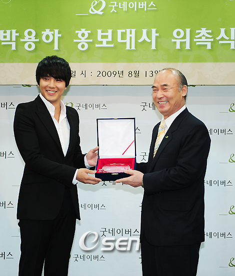 한류스타 박용하의 국제구호개발NGO 굿네이버스 홍보대사 위촉식이 13일 오전 서울 용산구 굿네이버스 국제본부 지하강당에서 열렸다. 이 날 위촉식은 박용하의 소감 발표 및 활동 계획, 위촉패 전달, 굿네이버스 직원 축하 메세지 전달 등의 순서로 진행됐다. 굿네이버스는 한국인에 의해 설립 되어 전 세계 23개국에서 활동하고 있는 국제구호개발NGO이며, 현재 홍보대사로 최수종, 변정수, 김선아, 김혜수, 김종석, 박준형, 정종철 등이 활동하고 있다. 박용하가 굿네이버스 이일화 회장으로부터 위촉패를 받은 후 포토타임을 갖고 있다./민경훈 기자 rumi@osen.co.kr