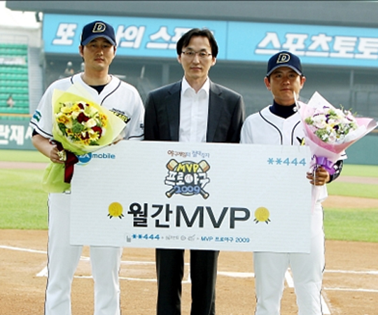 두산 베어스는 13일 잠실 한화 전에 앞서 팀 자체적으로 선정하는 'EA 모바일 7월 MVP' 에 대한 시상식을 가졌다. 7월 MVP 투수부문에는 이재우(29), 타자부문에는 손시헌(29)이 각각 선정되었다. 지난 7월 한 달간 1승 3홀드를 거둔 이재우는 8경기서 17⅓이닝 동안 18개의 탈삼진을 곁들이며 평균 자책점 3.63을 기록했으며 선발과 구원을 오가며 팀이 상위권을 유지하는 데 커다란 역할을 수행했다. 또한 국내 최고 유격수로 손꼽히는 손시헌은 7월 한 달간 18경기서 2할7푼3리(55타수 15안타) 3홈런 6타점으로 수비에서의 맹활약은 물론 하위 타선의 중심 타자 역할까지 충실히 해내며 팀을 이끌었다. 한편 이날 시상식에는 EA 모바일의 김대섭 부장이 부상인 폴로 랄프로렌 상품권과 꽃다발 등을 시상했다. farinelli@osen.co.kr 두산 베어스 제공.