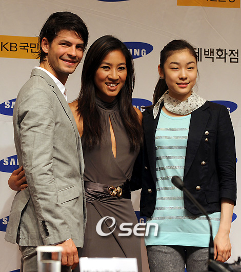 2009 ISU 세계선수권대회 챔피언인 김연아를 비롯한 전세계 피겨챔피언들이 총출동하는 지상 최대의 아이스쇼, '삼성 애니콜-하운젠 아이스 올스타즈 2009'에 앞서 13일 오후 장충동 신라호텔에서 김연아,미셸 콴,스테판 랑비엘,브라인 오셔 코치가 참여한 가운데 기자회견이 열렸다. 랑비엘,미셸 콴,김연아가 취재진을 향해 포토타임을 갖고 있다./김영민 기자ajyoung@osen.co.kr