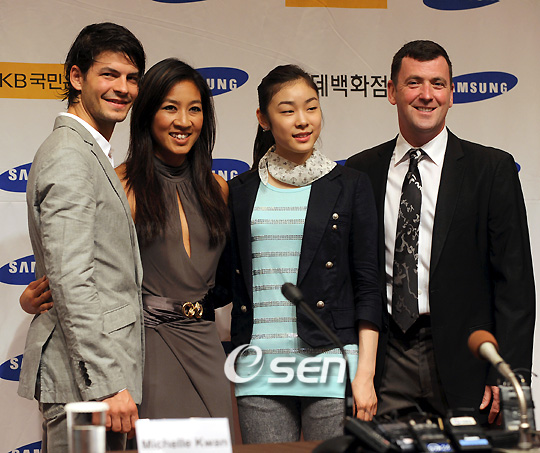 2009 ISU 세계선수권대회 챔피언인 김연아를 비롯한 전세계 피겨챔피언들이 총출동하는 지상 최대의 아이스쇼, '삼성 애니콜-하우젠 아이스 올스타즈 2009'에 앞서 13일 오후 장충동 신라호텔에서 김연아,미셸 콴,스테판 랑비엘,브라인 오셔 코치가 참여한 가운데 기자회견이 열렸다. 참석자들이 포토타임을 갖고 있다./김영민 기자ajyoung@osen.co.kr