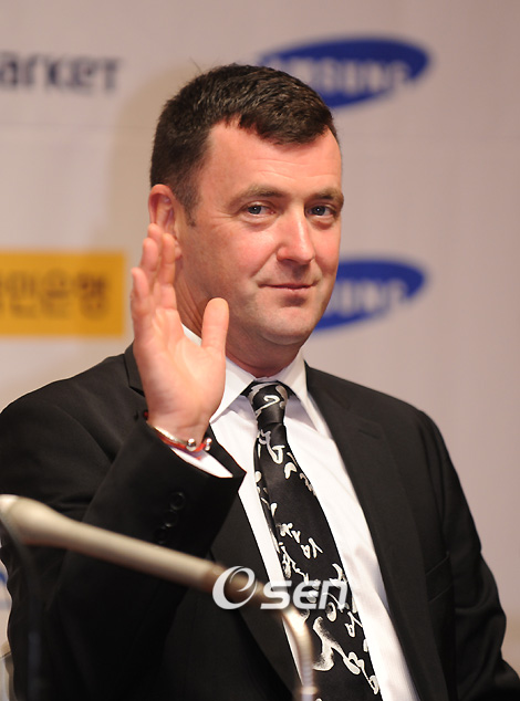 2009 ISU 세계선수권대회 챔피언인 김연아를 비롯한 전세계 피겨챔피언들이 총출동하는 지상 최대의 아이스쇼, '삼성 애니콜-하우젠 아이스 올스타즈 2009'에 앞서 13일 오후 장충동 신라호텔에서 김연아,미셸 콴,스테판 랑비엘,브라이언 오셔 코치가 참여한 가운데 기자회견이 열렸다. 이번 아이스쇼의 총감독 브라이언 오셔가 인사말을 하고 있다./김영민 기자ajyoung@osen.co.kr