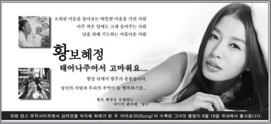 오는 16일 생일을 맞는 가수 황보의 팬들이 신문광고 이벤트로 축하의 뜻을 전한다. 황보의 인터넷 팬 카페 '방주'의 회원들은 오는 15일자 신문에 '태어나줘서 고맙다'는 내용의 생일축하 광고를 싣는다. 이번 깜짝 이벤트는 새 앨범 활동과 각종 예능프로그램 출연 등으로 바쁘게 지내는 황보를 응원하기 위한 팬들의 마음에서 시작됐다고. 한편 최근 케이블채널 MBC에브리원 '무한걸스'와 MBC '일요일 일요일 밤에-노다지' 등에서 활약 중인 황보는, 지난 13일 Mnet 'M카운트다운'의 컴백 무대를 시작으로 가수로서의 활동에도 박차를 가할 예정이다. 그녀의 신곡 '아리송'은 영국뿐 아니라 유럽에서 가장 인기 있는 음원 사이트인 '주노 다운로드 차트'에서 이미 1위까지 랭크된 바 있어 국내에서의 반응이 더욱 기대를 모은다. issue@osen.co.kr ▶ 황보, 영국 음악 사이트 상위권 유지 ▶ 황보 '아리송', 영국 음악사이트 이 시각 현재 1위 ▶ 황보, 영국 음악 차트 4위 기록 ▶ 황보, 수영복 입고 탄탄한 몸매 과시 황보 팬 카페 '방주'