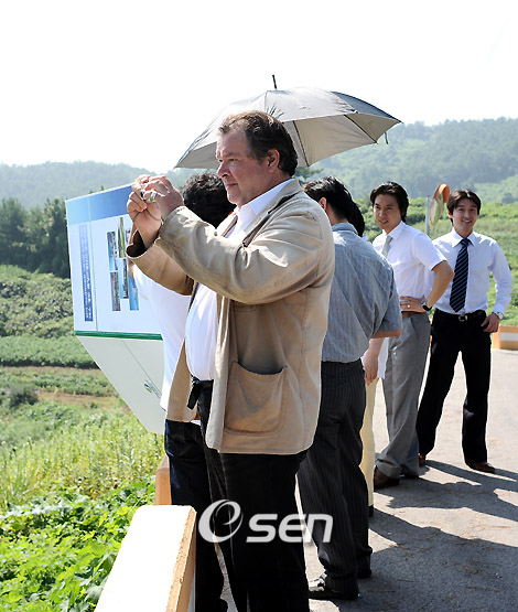 한국을 방문 중인 세계적인 건축가 윌리엄 알솝과 유명 조각가 노버트 브루너가 15일 여수 일정 이틀째를 맞아 여수시와 전남도가 추진하고 있는 개발지를 둘러 보며 참고 자료를 수집하는 등 투자 적정성 판단에 들어갔다. 2012년 세계박람회를 유치한 여수는 동북아 최고의 해양관광도시를 꿈꾸며 국내외 투자자들에게 러브콜을 보내고 있다. 여수가 가진 천혜의 자원과 세계박람회 개최도시라는 호재를 앞두고 여수를 바라보는 투자자들의 관심도 어느 때 보다 높다. 특히 여수시와 전남도가 추진하고 있는 경도 해양관광단지 조성사업은 214만 평방미터 규모의 경도라는 섬 전체를 테마관광단지로 개발하는 계획으로 1단계 사업비만 3200억 원이 넘게 들어가는 대규모 사업이다. 여수시에서는 세계 무대에 내놓아도 손색없는 골프장을 중심으로 밑그림을 그리고는 있지만 여타 골프장과 차별화해 기획단계에서부터 ‘친환경’을 주창하고 있다. 알솝이 견지하고 있는 건축의 특징도 ‘환경과 예술’이다. 주변과 조화하지 않는 건축은 죄악으로 여기는 게 알솝과 브루너의 건축 철학이다. 건축이 갖고 있는 예술적 요소를 실제 건축에 적극 반영함으로써 건축과 예술의 영역을 아우르는 작품세계로 유명한 알솝과 브루너는 건축회사인 독일 NOA2를 공동 설립해 운영하고 있다. 경도에 도착한 알솝이 개발 예정지 전경 사진을 찍는 등 지형 정보를 수집하고 있다. /여수=강희수 기자 100c@osen.co.kr