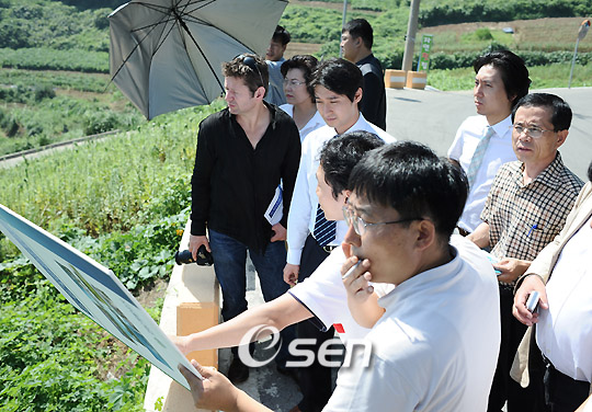 한국을 방문 중인 세계적인 건축가 윌리엄 알솝과 유명 조각가 노버트 브루너가 15일 여수 일정 이틀째를 맞아 여수시와 전남도가 추진하고 있는 개발지를 둘러 보며 참고 자료를 수집하는 등 투자 적정성 판단에 들어갔다. 2012년 세계박람회를 유치한 여수는 동북아 최고의 해양관광도시를 꿈꾸며 국내외 투자자들에게 러브콜을 보내고 있다. 여수가 가진 천혜의 자원과 세계박람회 개최도시라는 호재를 앞두고 여수를 바라보는 투자자들의 관심도 어느 때 보다 높다. 특히 여수시와 전남도가 추진하고 있는 경도 해양관광단지 조성사업은 214만 평방미터 규모의 경도라는 섬 전체를 테마관광단지로 개발하는 계획으로 1단계 사업비만 3200억 원이 넘게 들어가는 대규모 사업이다. 여수시에서는 세계 무대에 내놓아도 손색없는 골프장을 중심으로 밑그림을 그리고는 있지만 여타 골프장과 차별화해 기획단계에서부터 ‘친환경’을 주창하고 있다. 알솝이 견지하고 있는 건축의 특징도 ‘환경과 예술’이다. 주변과 조화하지 않는 건축은 죄악으로 여기는 게 알솝과 브루너의 건축 철학이다. 건축이 갖고 있는 예술적 요소를 실제 건축에 적극 반영함으로써 건축과 예술의 영역을 아우르는 작품세계로 유명한 알솝과 브루너는 건축회사인 독일 NOA2를 공동 설립해 운영하고 있다. 경도를 찾은 알솝과 브루너 일행에게 여수시 투자유치 담당 공무원이 상황판을 놓고 개발 계획을 설명하고 있다. /여수=강희수 기자 100c@osen.co.kr