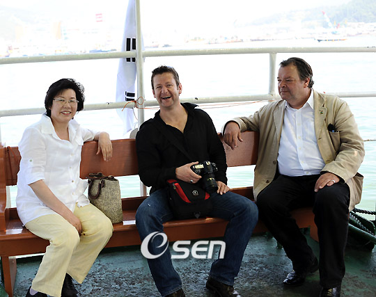 한국을 방문 중인 세계적인 건축가 윌리엄 알솝과 유명 조각가 노버트 브루너가 15일 여수 일정 이틀째를 맞아 여수시와 전남도가 추진하고 있는 개발지를 둘러 보며 참고 자료를 수집하는 등 투자 적정성 판단에 들어갔다. 2012년 세계박람회를 유치한 여수는 동북아 최고의 해양관광도시를 꿈꾸며 국내외 투자자들에게 러브콜을 보내고 있다. 여수가 가진 천혜의 자원과 세계박람회 개최도시라는 호재를 앞두고 여수를 바라보는 투자자들의 관심도 어느 때 보다 높다. 특히 여수시와 전남도가 추진하고 있는 경도 해양관광단지 조성사업은 214만 평방미터 규모의 경도라는 섬 전체를 테마관광단지로 개발하는 계획으로 1단계 사업비만 3200억 원이 넘게 들어가는 대규모 사업이다. 여수시에서는 세계 무대에 내놓아도 손색없는 골프장을 중심으로 밑그림을 그리고는 있지만 여타 골프장과 차별화해 기획단계에서부터 ‘친환경’을 주창하고 있다. 알솝이 견지하고 있는 건축의 특징도 ‘환경과 예술’이다. 주변과 조화하지 않는 건축은 죄악으로 여기는 게 알솝과 브루너의 건축 철학이다. 건축이 갖고 있는 예술적 요소를 실제 건축에 적극 반영함으로써 건축과 예술의 영역을 아우르는 작품세계로 유명한 알솝과 브루너는 건축회사인 독일 NOA2를 공동 설립해 운영하고 있다. 경도를 둘러보고 돌아오는 배 안에서 여수시의회 차성업 의원(왼쪽)이 브루너, 알솝과 함께 환담을 나누며 환하게 웃고 있다. /여수=강희수 기자 100c@osen.co.kr